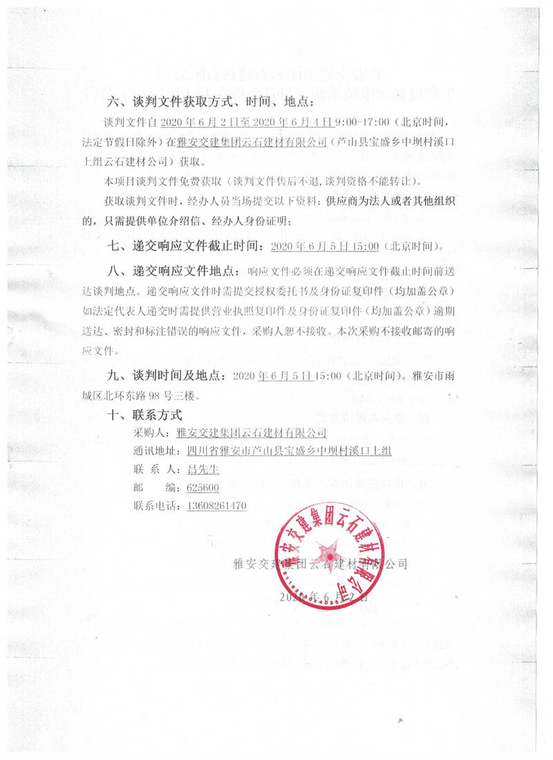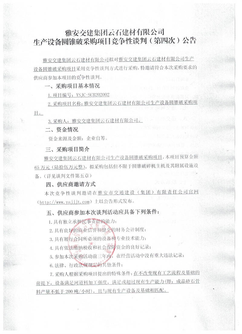 雅安交建集團(tuán)云石建材有限公司生產(chǎn)設(shè)備圓錐破采購項(xiàng)目競(jìng)爭(zhēng)性談判(第四次)公告