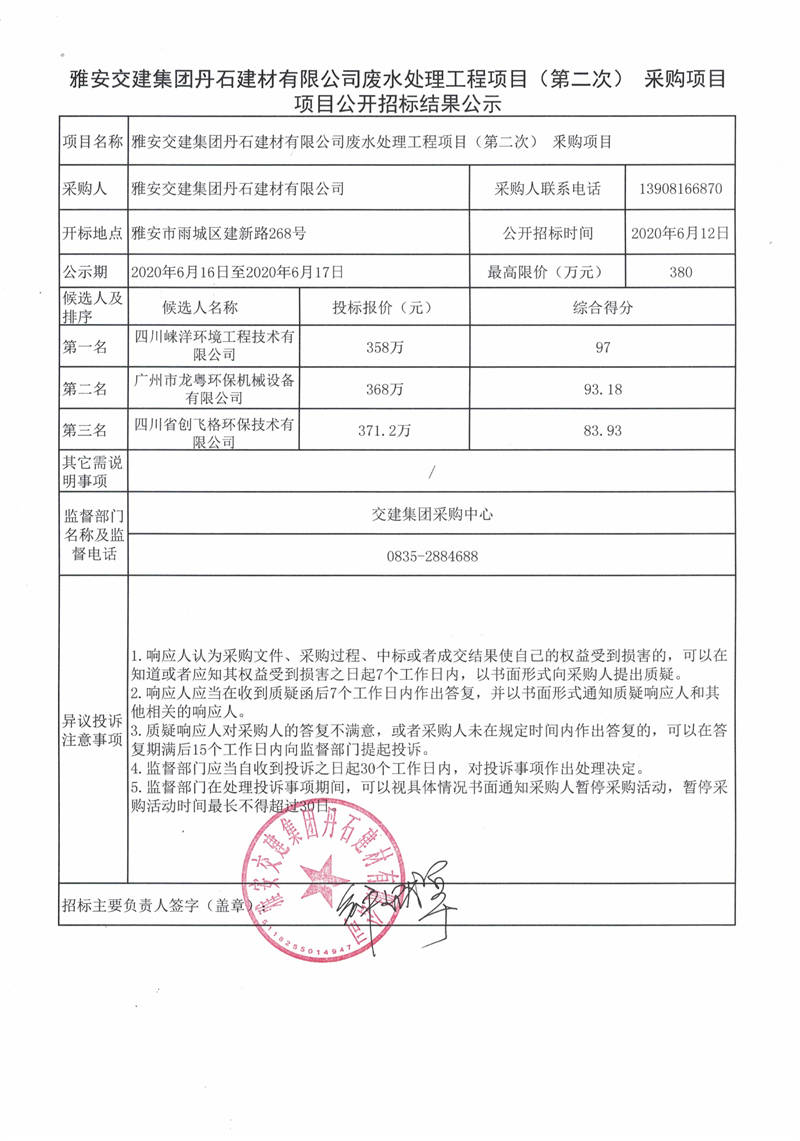 雅安交建集團(tuán)丹石建材有限公司廢水處理工程項(xiàng)目(第二次)采購項(xiàng)目公開招標(biāo)結(jié)果公示