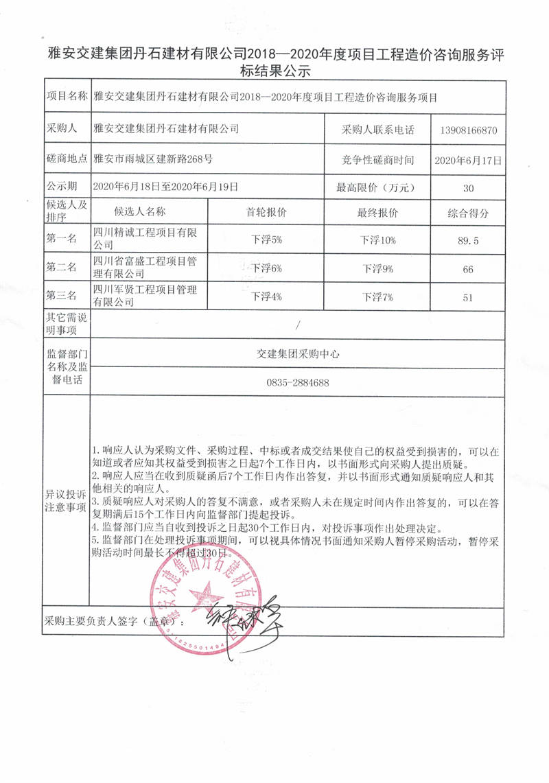 雅安交建集團丹石建材有限公司2018—2020年度項目工程造價咨詢服務(wù)評標結(jié)果公示