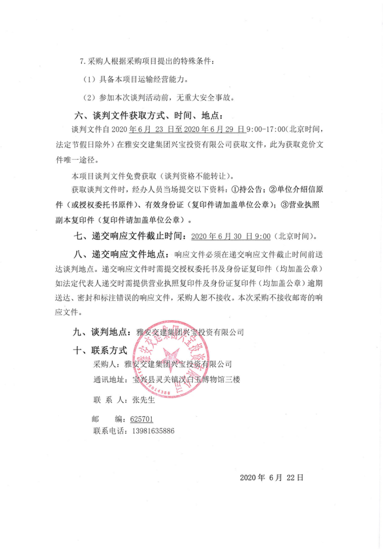 雅安交建集團(tuán)興寶投資有限公司靈關(guān)鎮(zhèn)代碑寺物流園土地整理?xiàng)壴\(yùn)輸采購(gòu)項(xiàng)目二期競(jìng)爭(zhēng)性談判公告