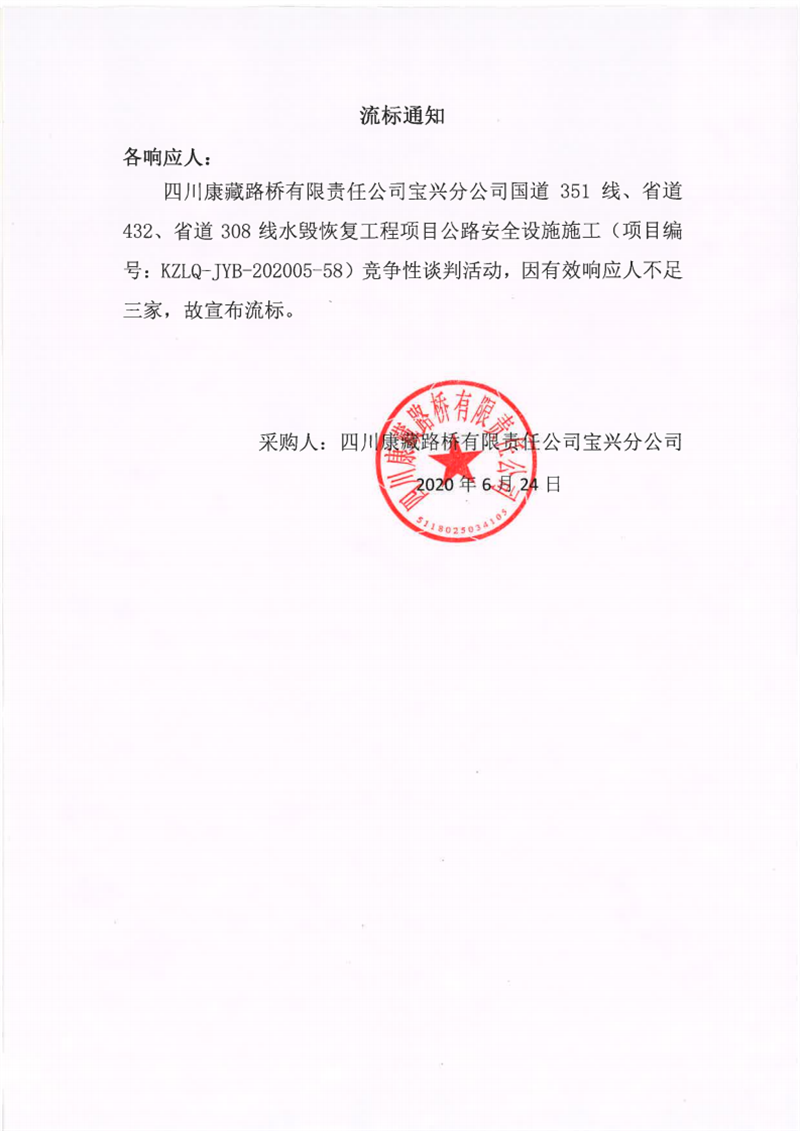 四川康藏路橋有限責任公司寶興分公司國道351線、省道432線、省道308線水毀修復(fù)工程項目公路安全設(shè)施施工流標通知