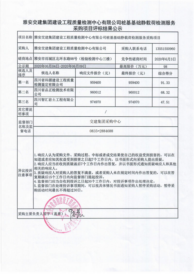 雅安交建集團(tuán)建設(shè)工程質(zhì)量檢測(cè)中心有限公司樁基基礎(chǔ)靜載荷檢測(cè)服務(wù)采購(gòu)項(xiàng)目評(píng)標(biāo)結(jié)果公示