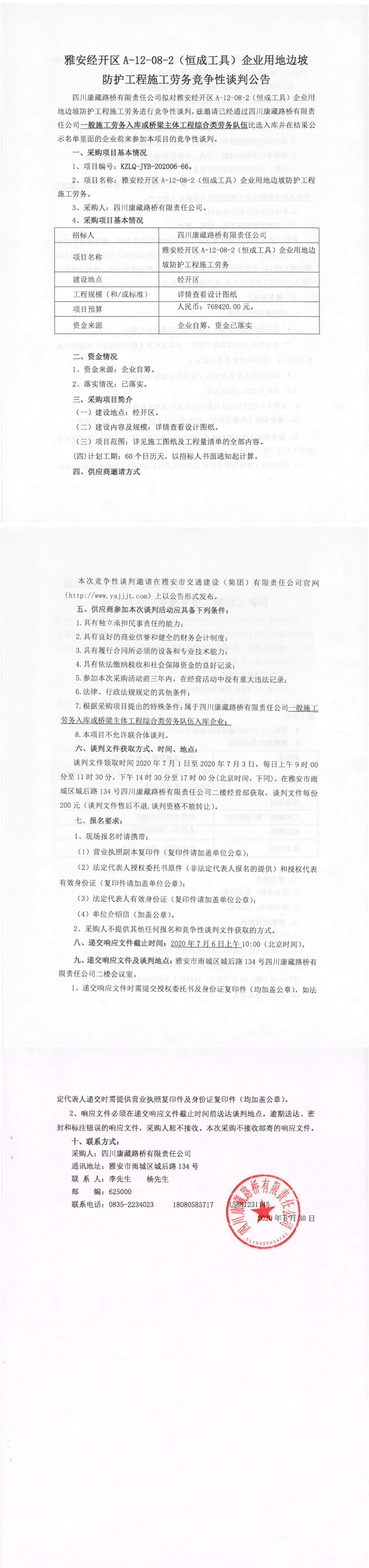 四川康藏路橋有限責(zé)任公司雅安經(jīng)開區(qū)A-12-08-2(恒成工具)企業(yè)用地邊坡防護(hù)工程施工勞務(wù)競(jìng)爭(zhēng)性談判公告