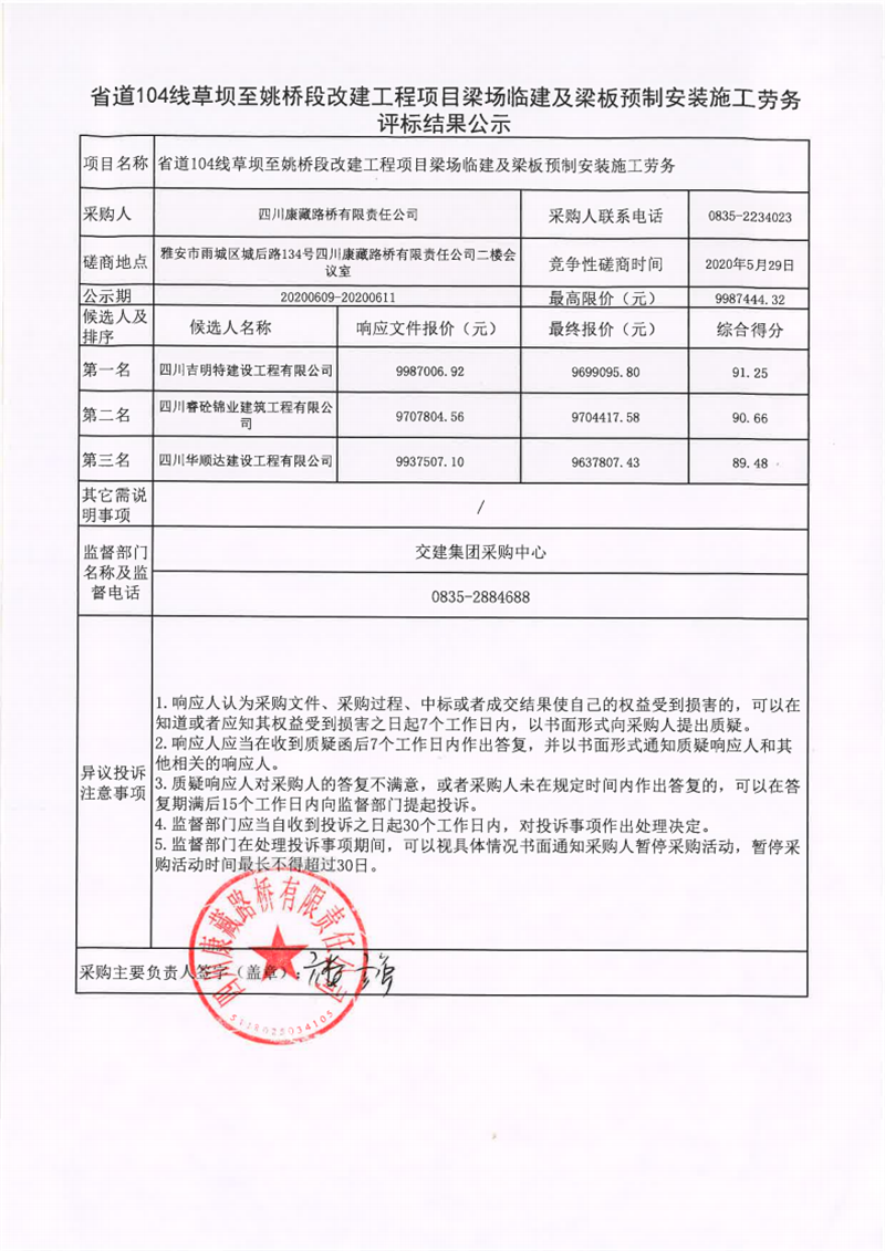 四川康藏路橋有限責(zé)任公司省道104線草壩至姚橋段改建工程項(xiàng)目梁場(chǎng)臨建及梁板預(yù)制安裝施工勞務(wù)評(píng)標(biāo)結(jié)果公示