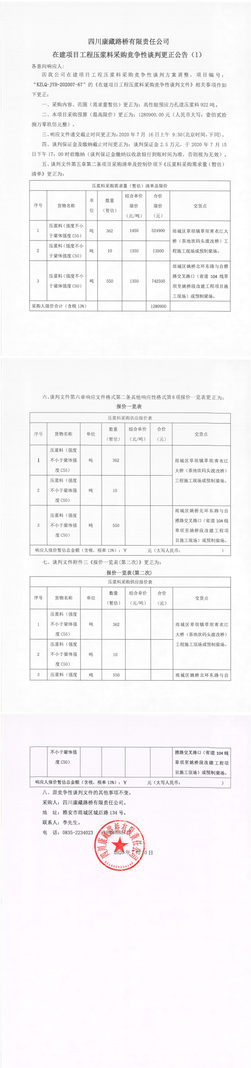 四川康藏路橋有限責(zé)任公司在建項(xiàng)目工程壓漿料采購(gòu)競(jìng)爭(zhēng)性談判更正公告(1)