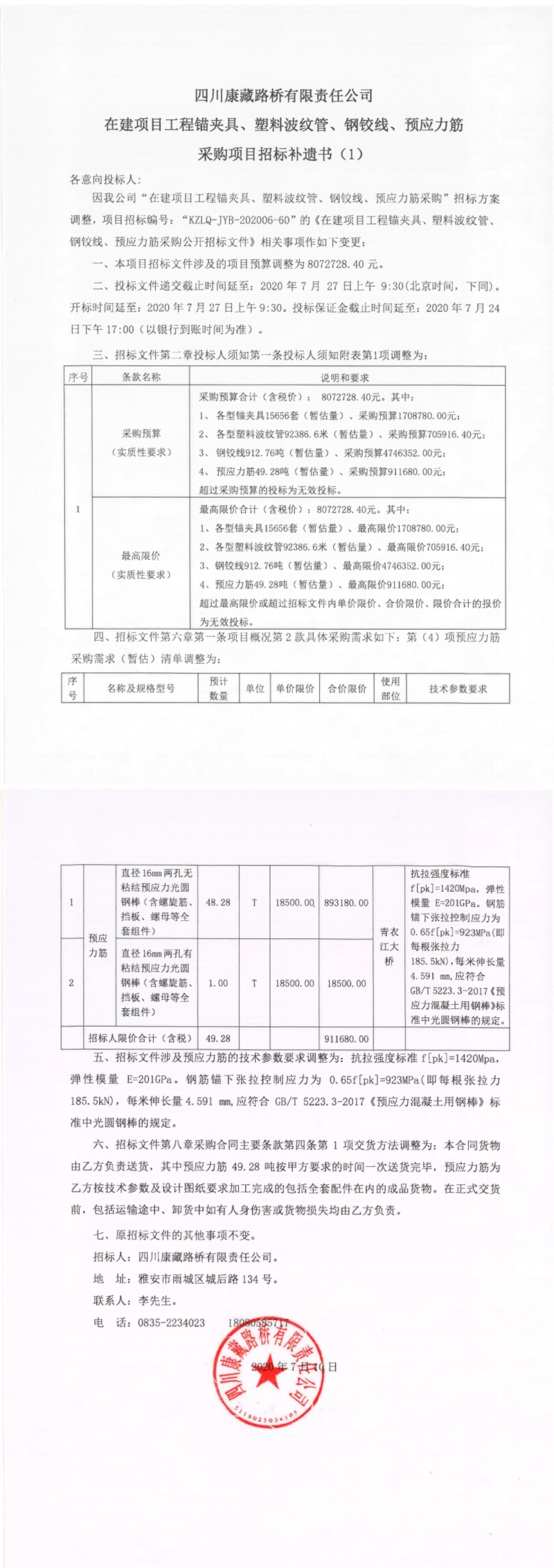 四川康藏路橋有限責(zé)任公司在建項(xiàng)目工程錨夾具、塑料波紋管、鋼鉸線、預(yù)應(yīng)力筋采購項(xiàng)目招標(biāo)補(bǔ)遺書(1)