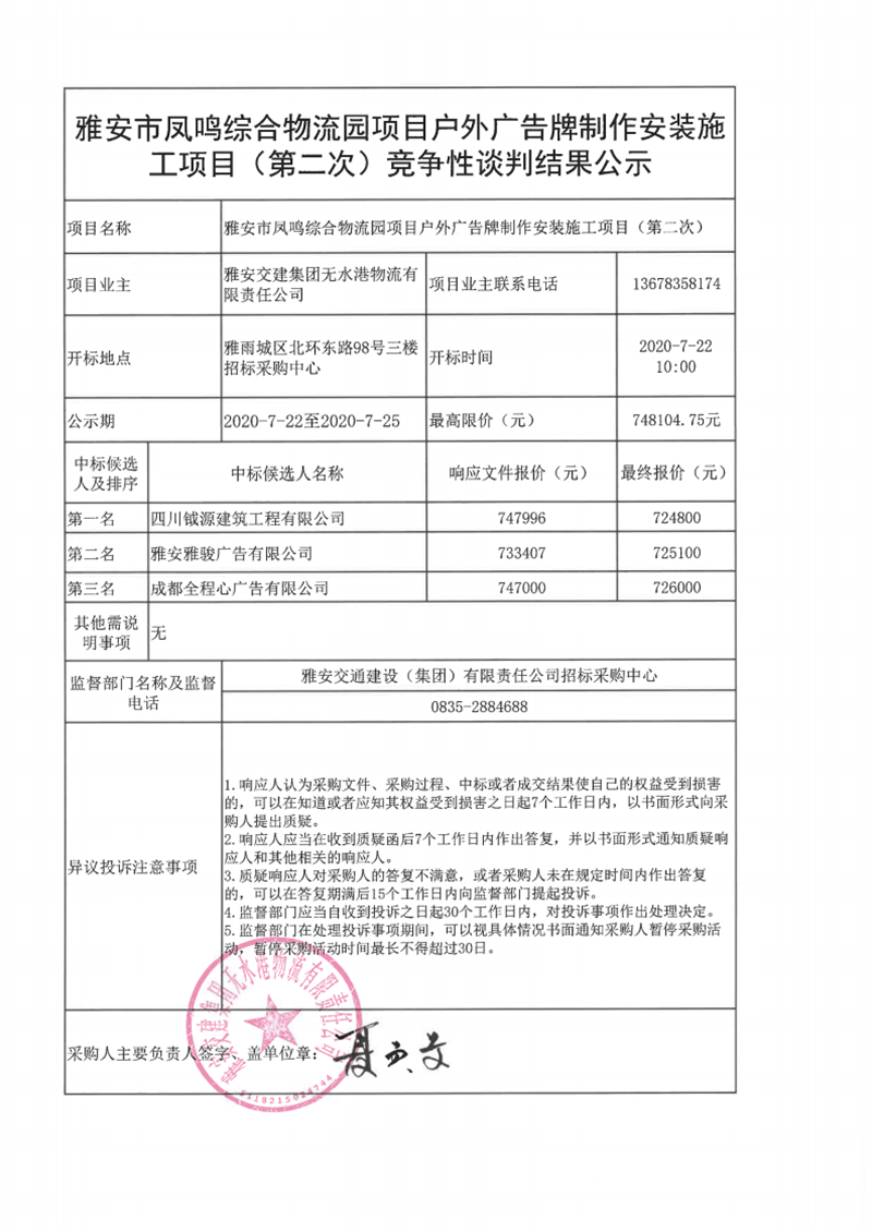 雅安交建集團(tuán)無水港物流有限責(zé)任公司雅安市鳳鳴綜合物流園項目戶外廣告牌制作安裝施工項目(第二次)競爭性談判結(jié)果公示