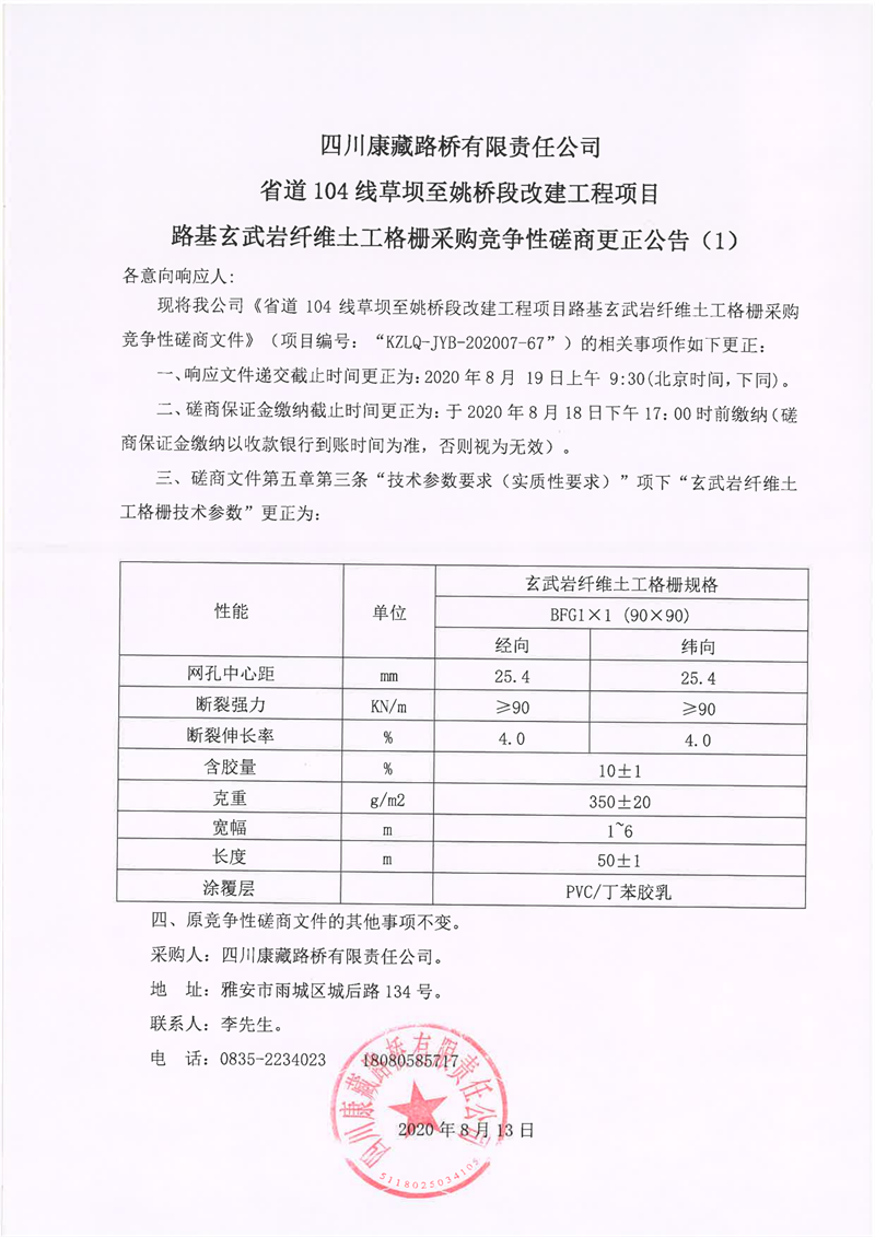 四川康藏路橋有限責(zé)任公司省道104線草壩至姚橋段改建工程項(xiàng)目路基玄武巖纖維土工格柵采購競爭性磋商更正公告(1)