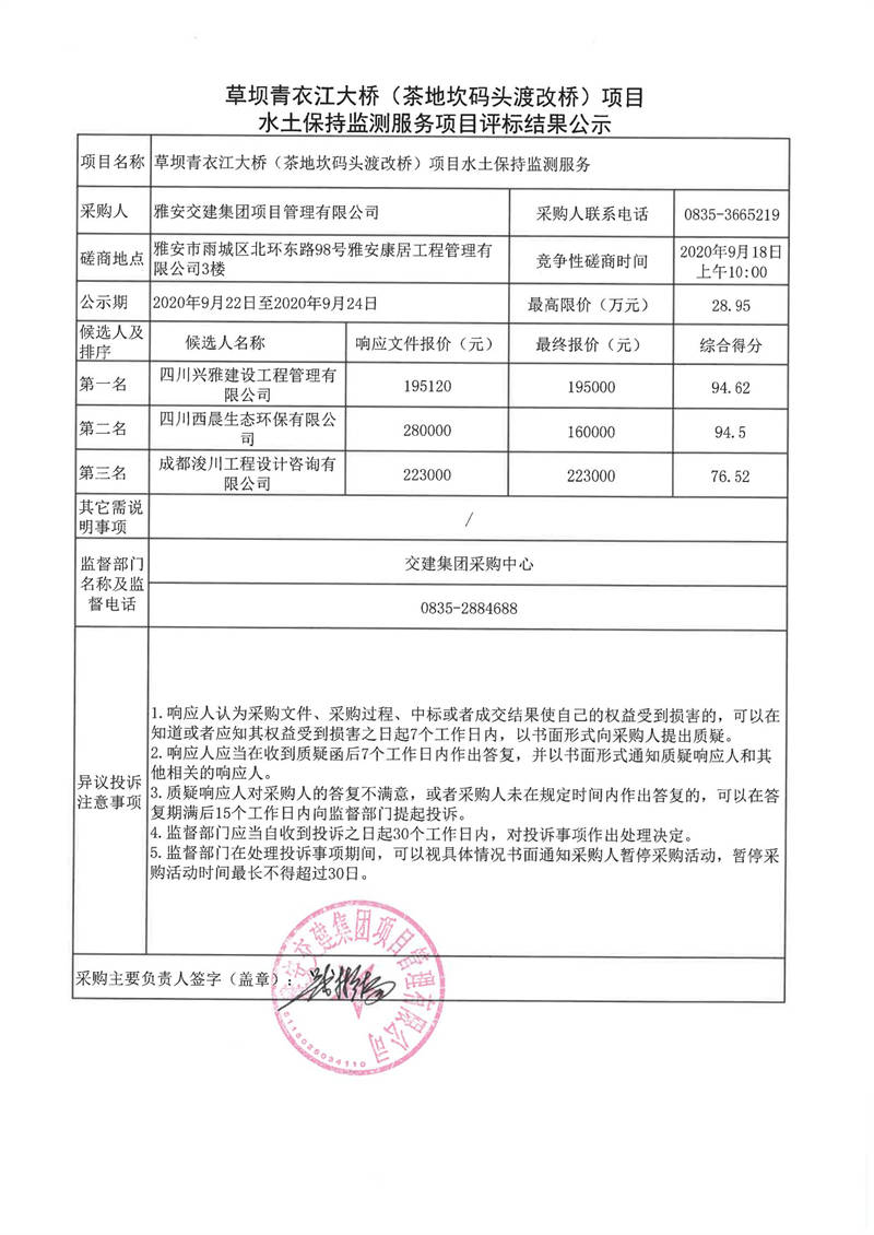 雅安交建集團項目管理有限公司草壩青衣江大橋(茶地坎碼頭渡改橋)項目水土保持監(jiān)測服務(wù)項目評標結(jié)果公示
