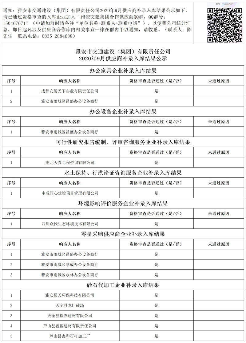 雅安市交通建設(shè)(集團)有限責(zé)任公司2020年9月供應(yīng)商補錄入庫結(jié)果公示