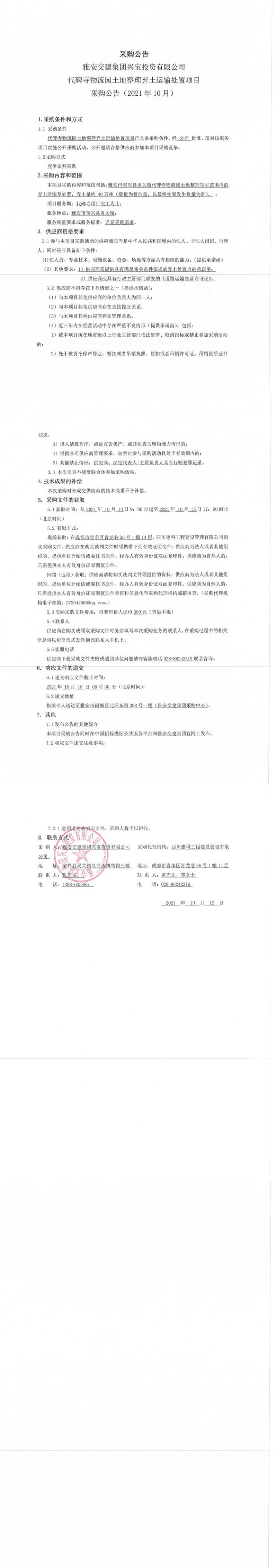 雅安交建集團(tuán)興寶投資有限公司代碑寺物流園土地整理?xiàng)壨吝\(yùn)輸處置項(xiàng)目采購(gòu)公告