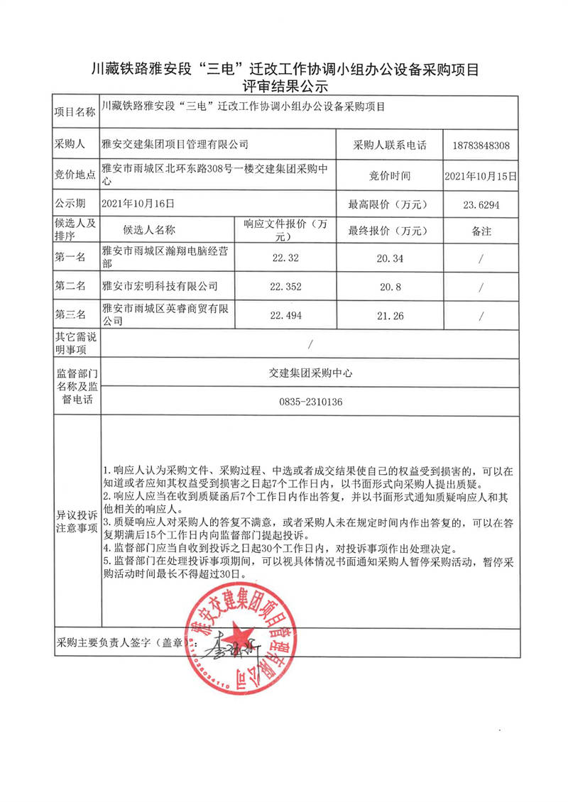 雅安交建集團(tuán)項(xiàng)目管理有限公司川藏鐵路雅安段“三電”遷改工作協(xié)調(diào)小組辦公設(shè)備采購項(xiàng)目評審結(jié)果公示