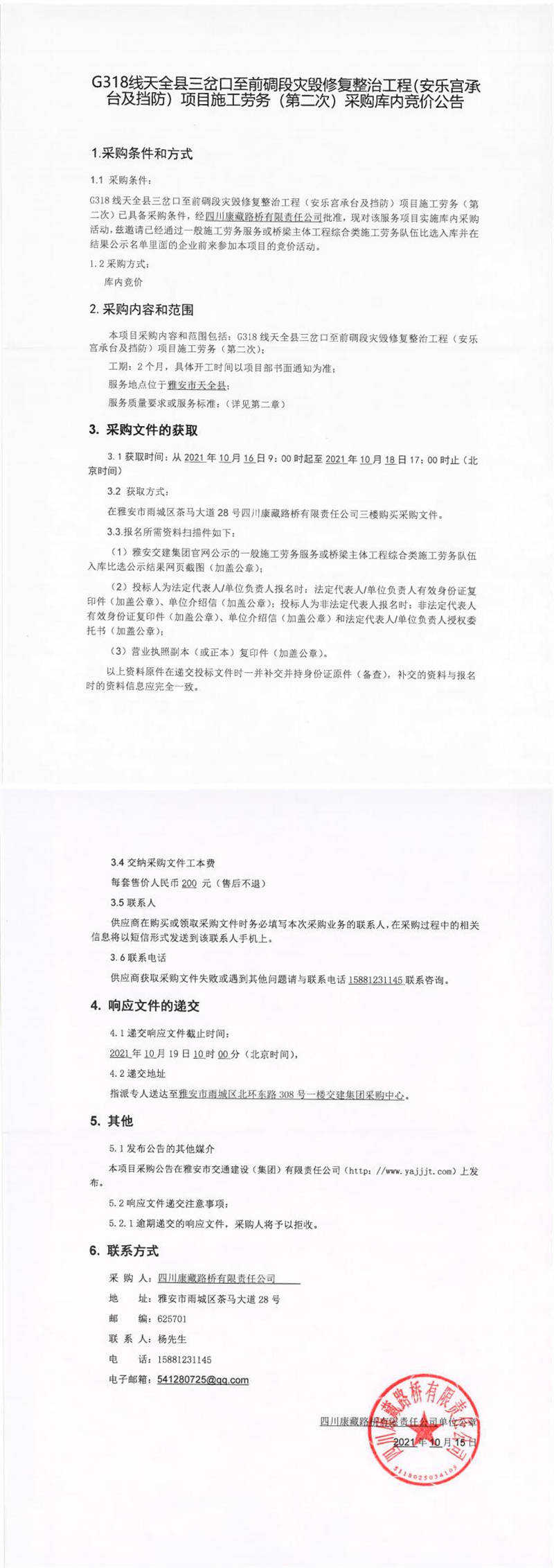 四川康藏路橋有限責(zé)任公司G318線(xiàn)天全縣三岔口至前碉段災(zāi)毀修復(fù)整治工程(安樂(lè)宮承臺(tái)及擋防)項(xiàng)目施工勞務(wù)(第二次)采購(gòu)庫(kù)內(nèi)競(jìng)價(jià)公告