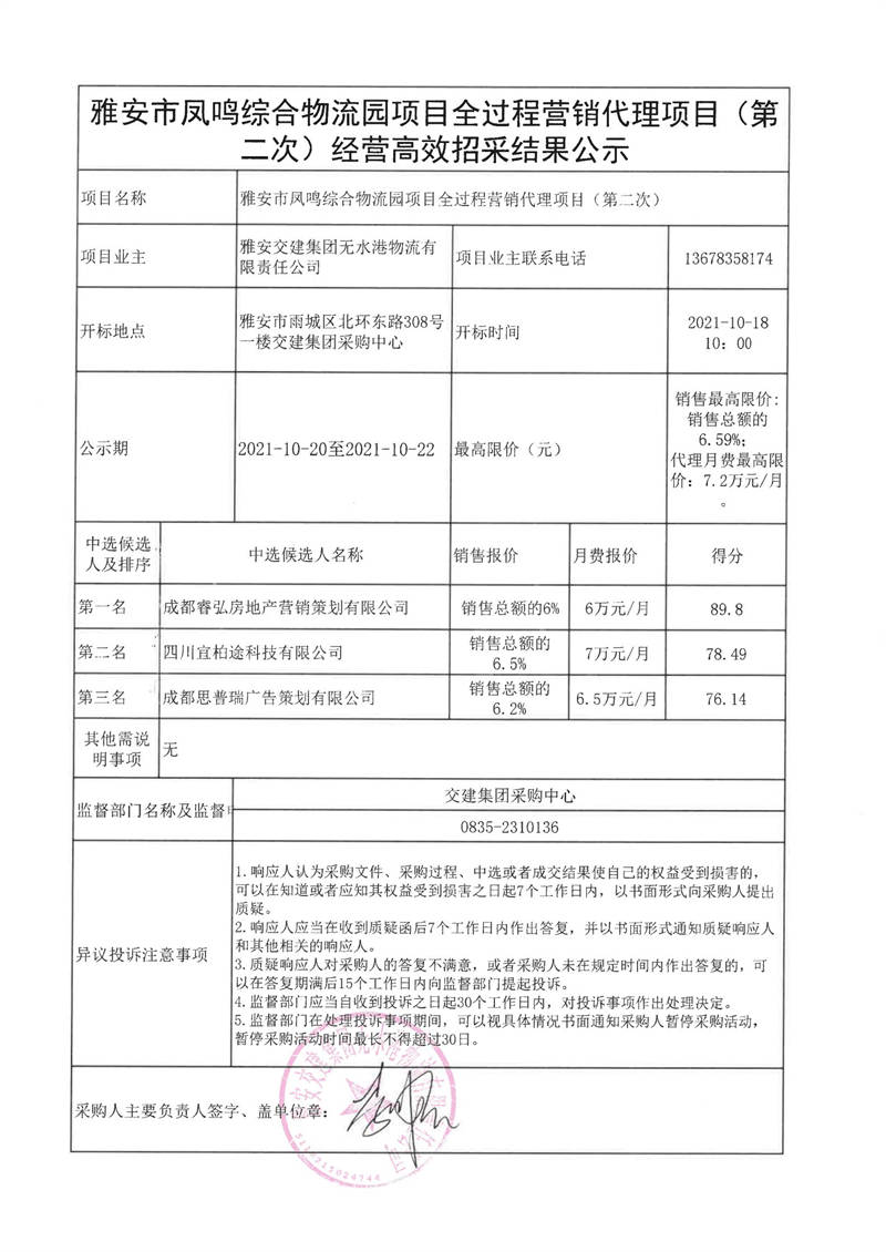 雅安交建集團無水港物流有限責任公司雅安市鳳鳴綜合物流園項目全過程營銷代理項目(第二次)經(jīng)營高效招采結(jié)果公示