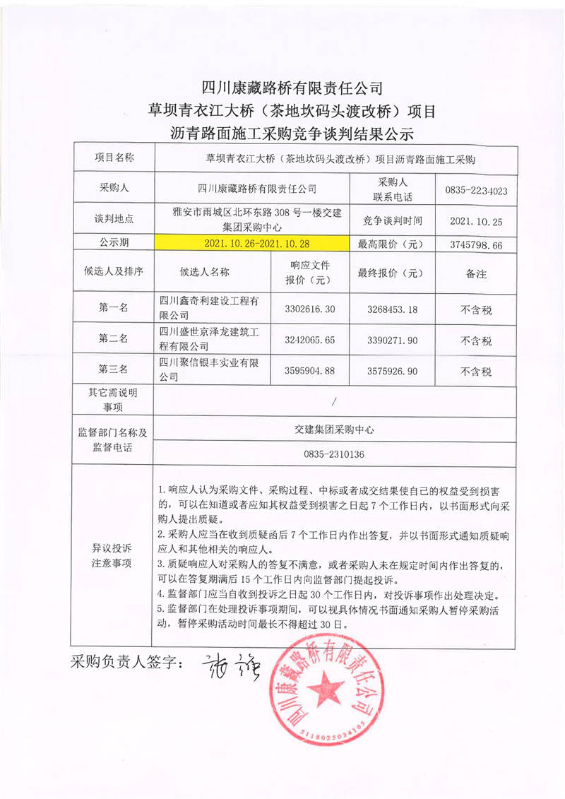 四川康藏路橋有限責(zé)任公司草壩青衣江大橋(茶地坎碼頭渡改橋)項目瀝青路面施工采購競爭談判結(jié)果公示