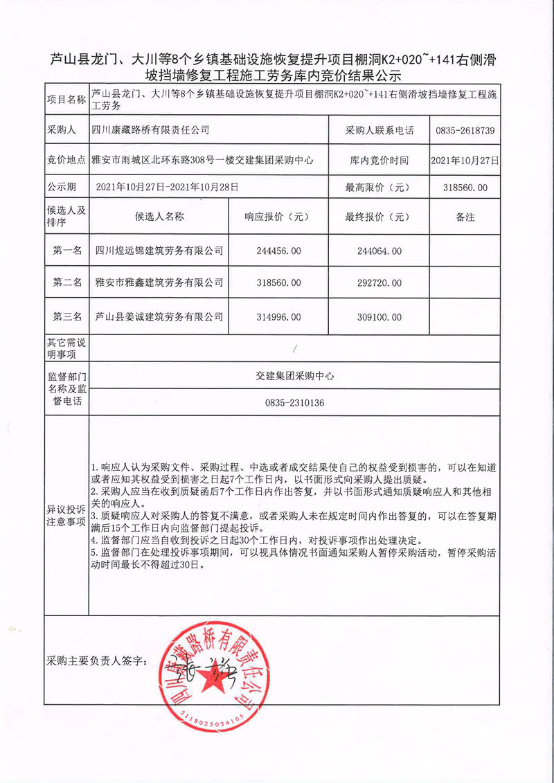 四川康藏路橋有限責(zé)任公司蘆山縣龍門、大川等8個鄉(xiāng)鎮(zhèn)基礎(chǔ)設(shè)施恢復(fù)提升項(xiàng)目棚洞K2+020~+141右側(cè)滑坡?lián)鯄π迯?fù)工程施工勞務(wù)庫內(nèi)競價結(jié)果公示