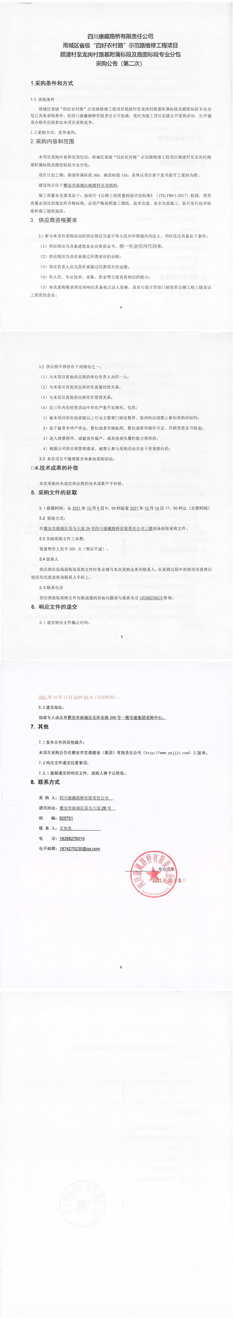 四川康藏路橋有限責(zé)任公司雨城區(qū)省級(jí)“四好農(nóng)村路”示范路維修工程項(xiàng)目順渡村至龍崗村路基附屬標(biāo)段及路面標(biāo)段專業(yè)分包采購(gòu)公告(第二次)