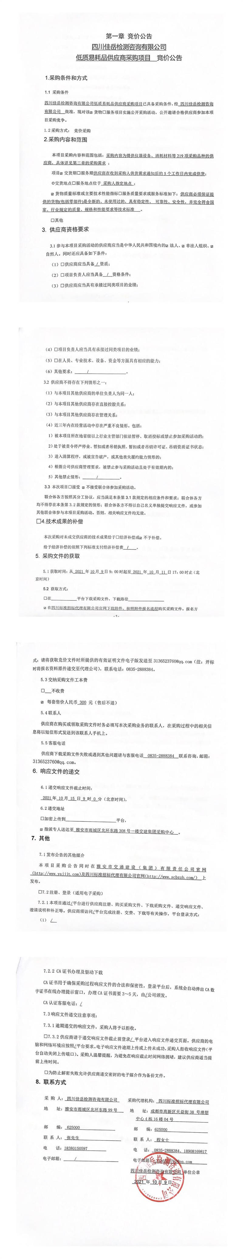 四川佳岳檢測咨詢有限公司低質(zhì)易耗品供應(yīng)商采購項目競價公告