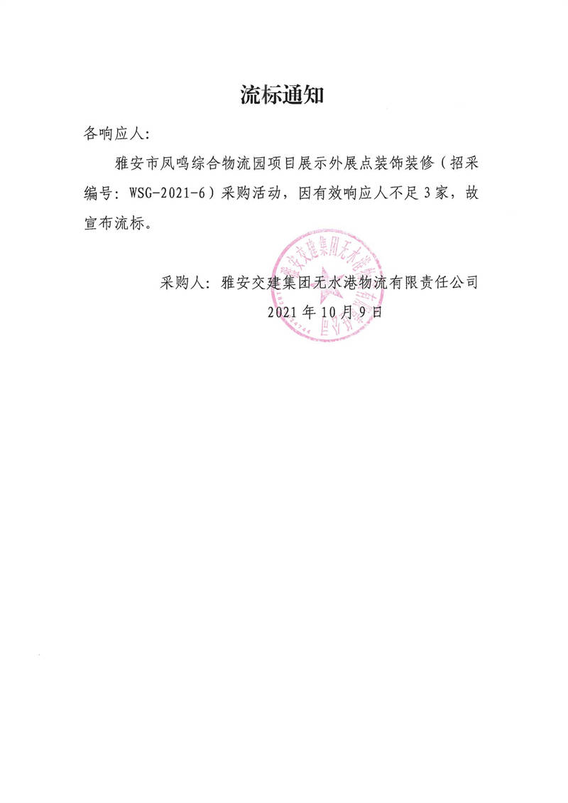 雅安交建集團(tuán)無(wú)水港物流有限責(zé)任公司雅安市鳳鳴綜合物流園項(xiàng)目展示外展點(diǎn)裝飾裝修流標(biāo)通知