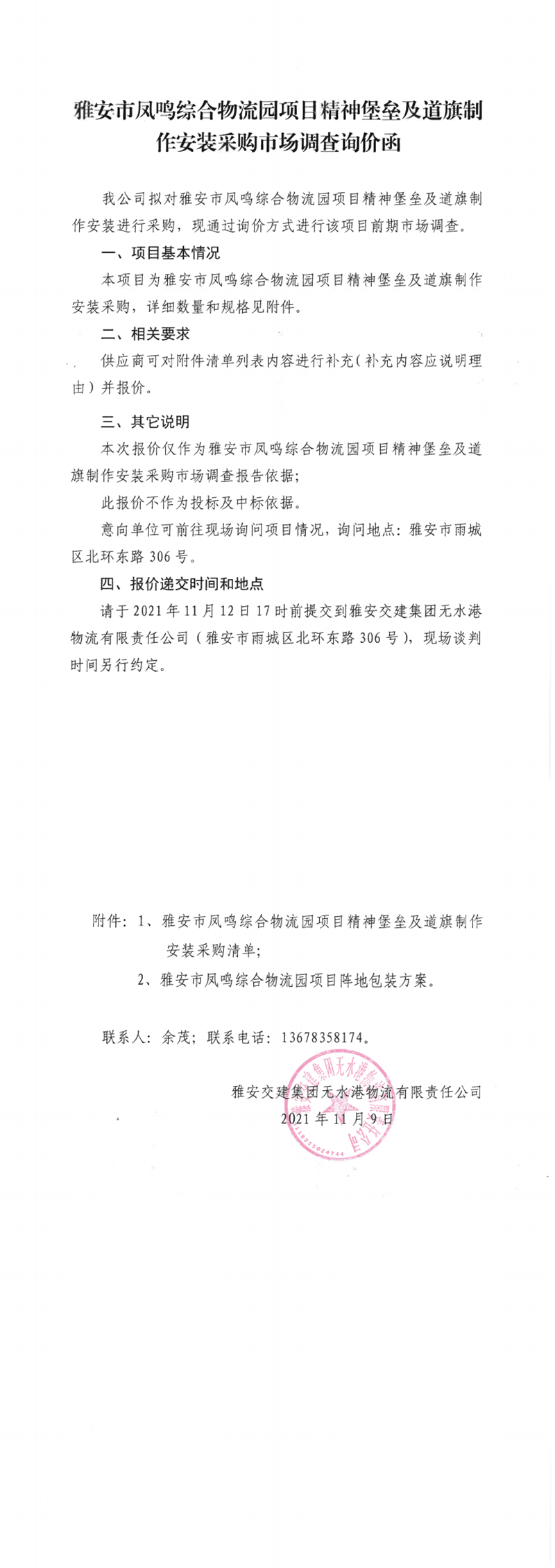 雅安交建集團(tuán)無水港物流有限責(zé)任公司雅安市鳳鳴綜合物流園項(xiàng)目精神堡壘及道旗制作安裝采購(gòu)市場(chǎng)調(diào)查詢價(jià)函