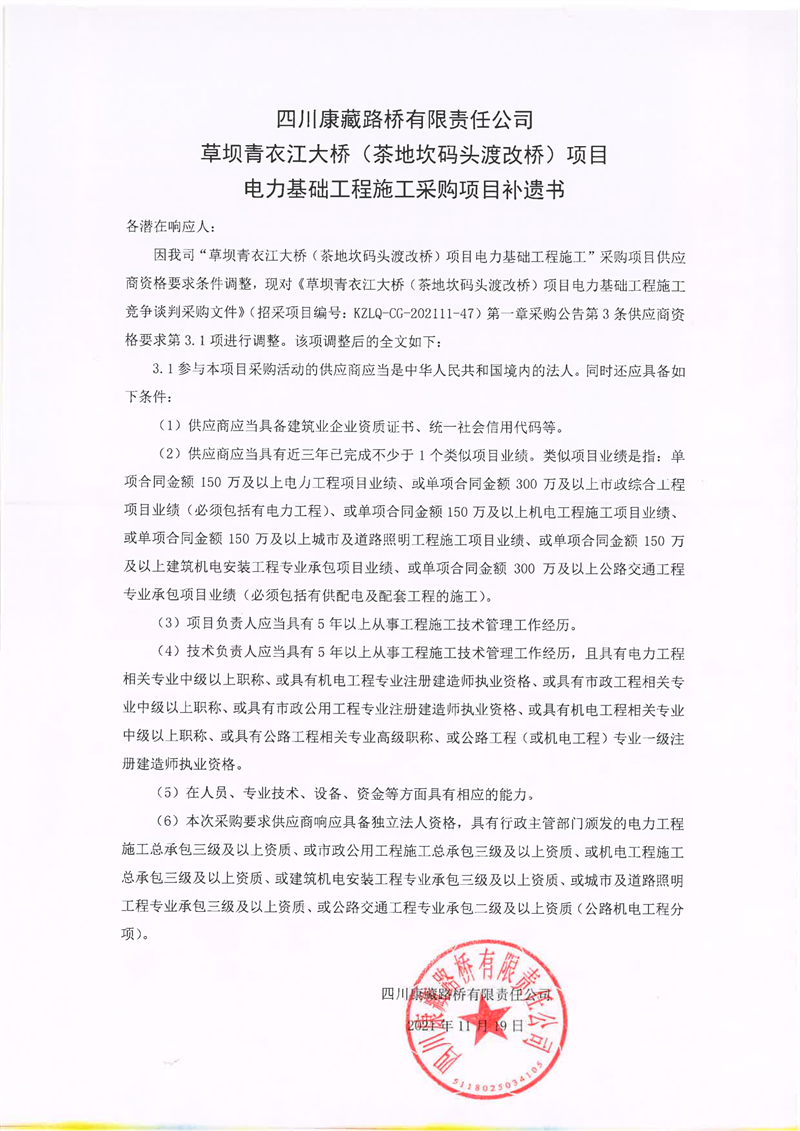 四川康藏路橋有限責(zé)任公司草壩青衣江大橋(茶地坎碼頭渡改橋)項(xiàng)目電力基礎(chǔ)工程施工采購(gòu)項(xiàng)目補(bǔ)遺書