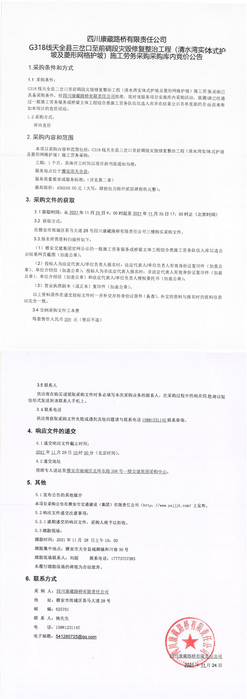 四川康藏路橋有限責(zé)任公司G318線天全縣三岔口至前碉段災(zāi)毀修復(fù)整治工程(清水灣實(shí)體式護(hù)坡及菱形網(wǎng)格護(hù)坡)施工勞務(wù)采購采購庫內(nèi)競價公告