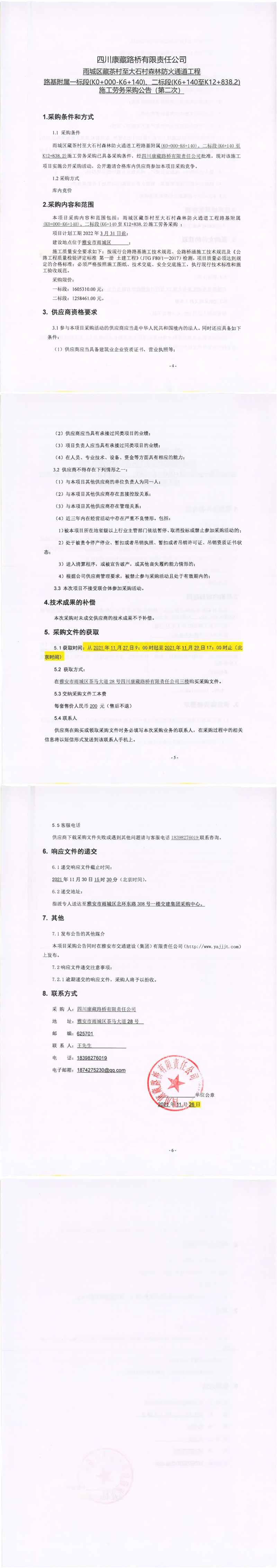四川康藏路橋有限責任公司雨城區(qū)藏茶村至大石村森林防火通道工程路基附屬一標段(K0+000-K6+140)、二標段(K6+140至K12+838.2)施工勞務采購公告(第二次)