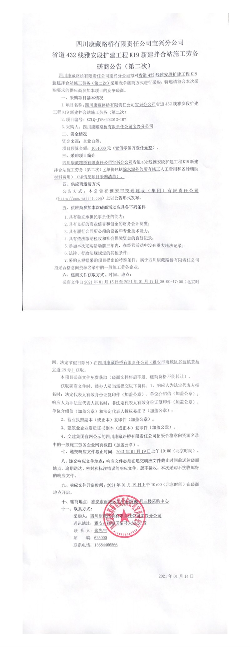 四川康藏路橋有限責(zé)任公司寶興分公司省道432線(xiàn)雅安段擴(kuò)建工程K19新建拌合站施工勞務(wù)磋商公告(第二次)