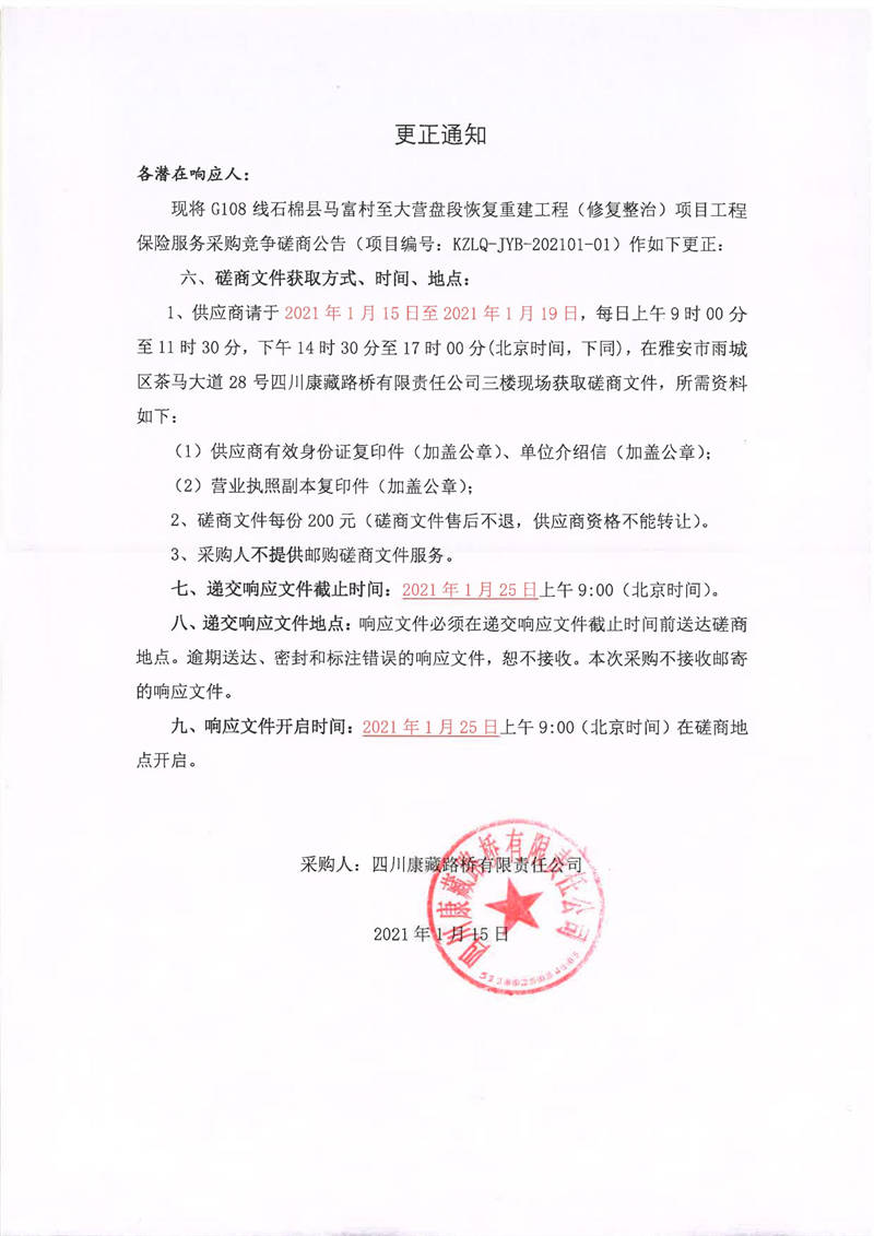 四川康藏路橋有限責(zé)任公司G108線石棉縣馬富村至大營盤段恢復(fù)重建工程(修復(fù)整治)項(xiàng)目工程保險(xiǎn)服務(wù)采購更正通知