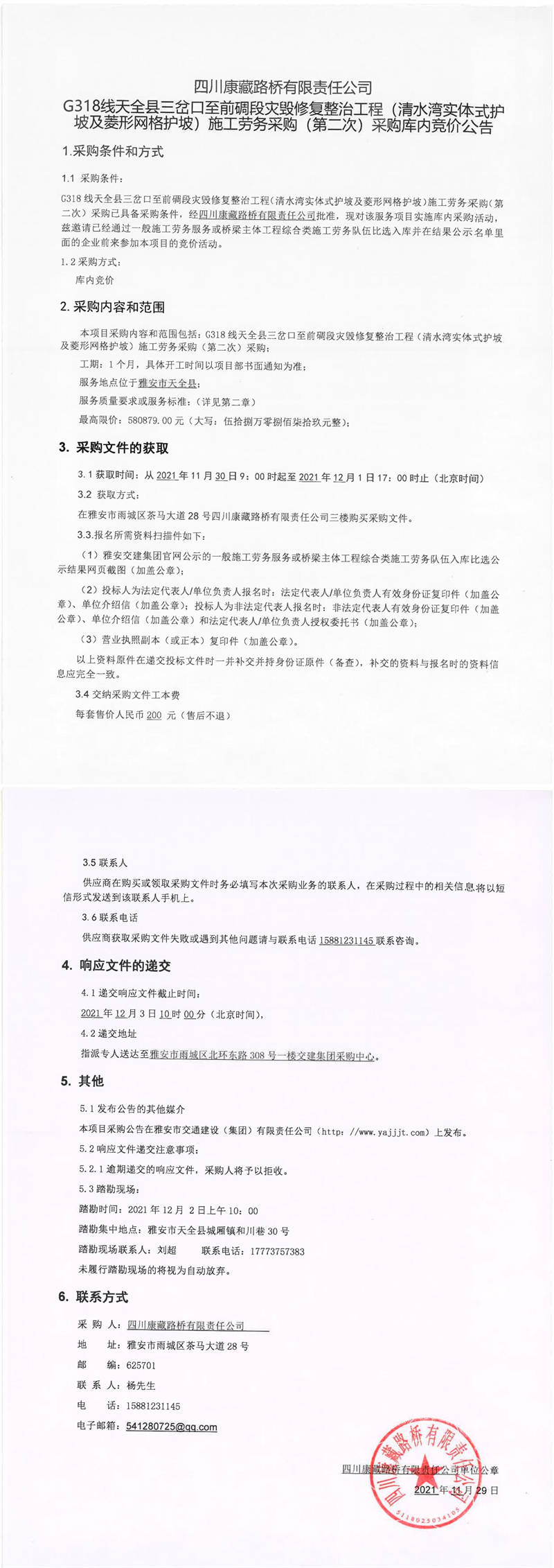 四川康藏路橋有限責(zé)任公司G318線天全縣三岔口至前碉段災(zāi)毀修復(fù)整治工程(清水灣實體式護坡及菱形網(wǎng)格護坡)施工勞務(wù)采購(第二次)采購庫內(nèi)競價公告