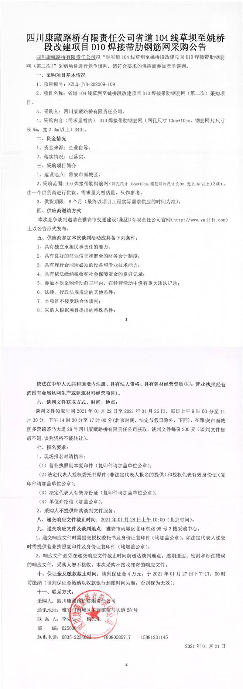 四川康藏路橋有限責(zé)任公司省道104線草壩至姚橋段改建項(xiàng)目D10焊接帶肋鋼筋網(wǎng)(第二次)采購公告