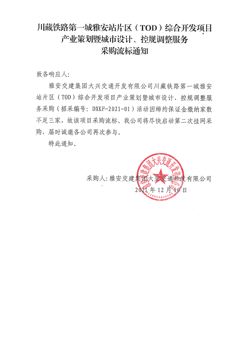 雅安交建集團(tuán)大興交通開發(fā)有限公司川藏鐵路第一城雅安站片區(qū)(TOD)綜合開發(fā)項(xiàng)目產(chǎn)業(yè)策劃暨城市設(shè)計(jì)、控規(guī)調(diào)整服務(wù)采購(gòu)流標(biāo)通知