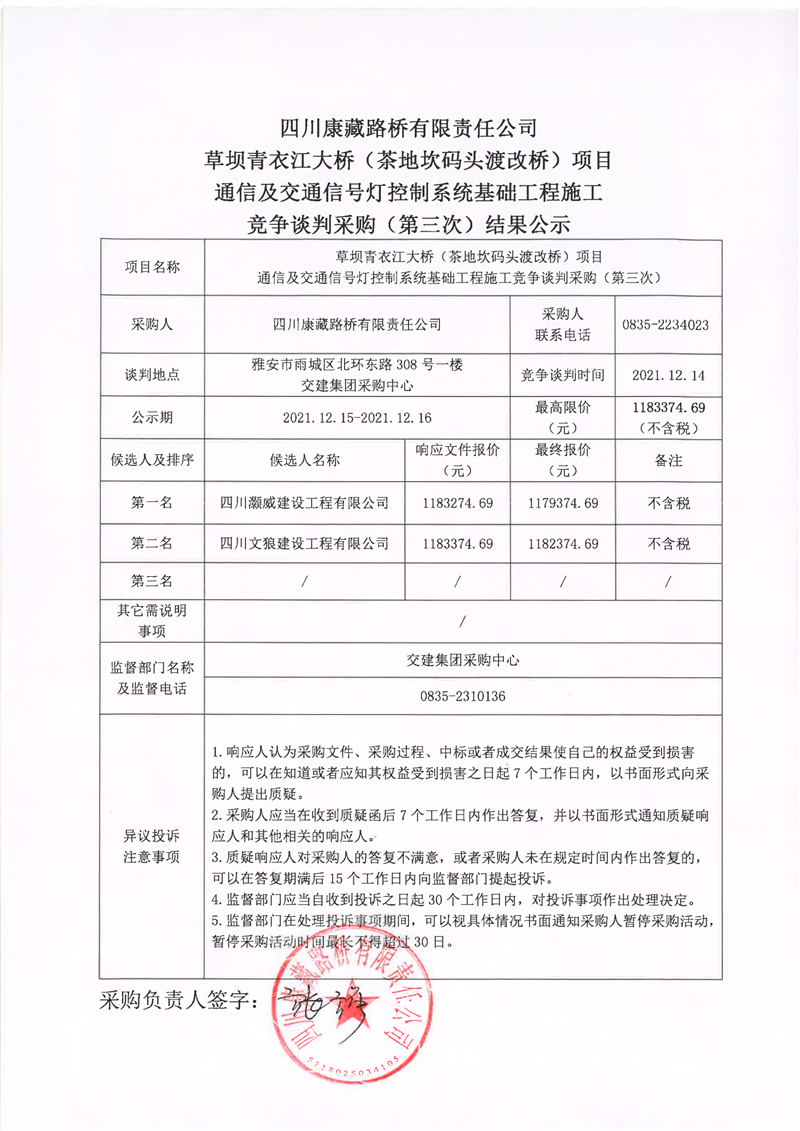 四川康藏路橋有限責(zé)任公司草壩青衣江大橋(茶地坎碼頭渡改橋)項目通信及交通信號燈控制系統(tǒng)基礎(chǔ)工程施工競爭談判采購(第三次)結(jié)果公示
