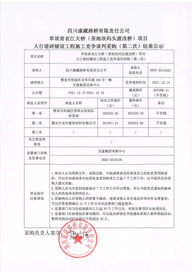 四川康藏路橋有限責(zé)任公司草壩青衣江大橋(茶地坎碼頭渡改橋)項目人行道磚鋪設(shè)工程施工競爭談判采購(第二次)結(jié)果公示