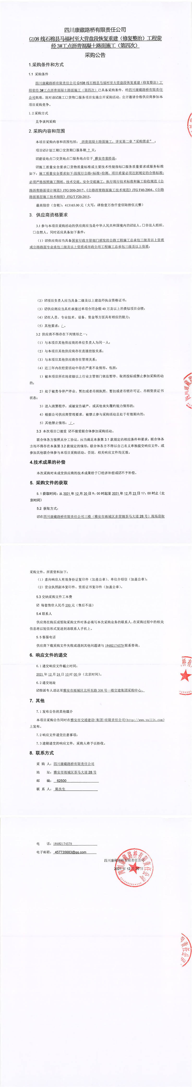 四川康藏路橋有限責(zé)任公司G108線石棉縣馬福村至大營(yíng)盤段恢復(fù)重建(修復(fù)整治)工程滎經(jīng)3#工點(diǎn)瀝青混凝土路面施工(第四次)采購(gòu)公告
