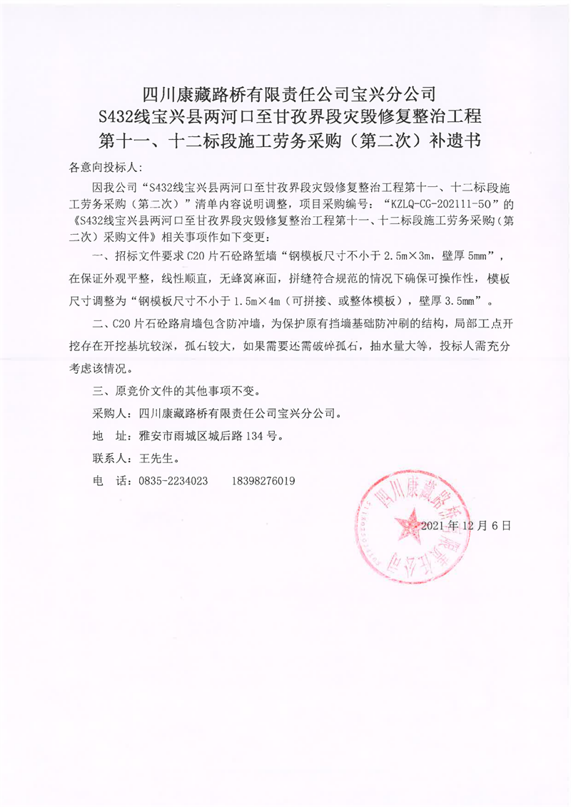 四川康藏路橋有限責(zé)任公司S432線寶興縣兩河口至甘孜界段災(zāi)毀修復(fù)整治工程第十一、十二標(biāo)段施工勞務(wù)采購(gòu)(第二次)補(bǔ)遺書