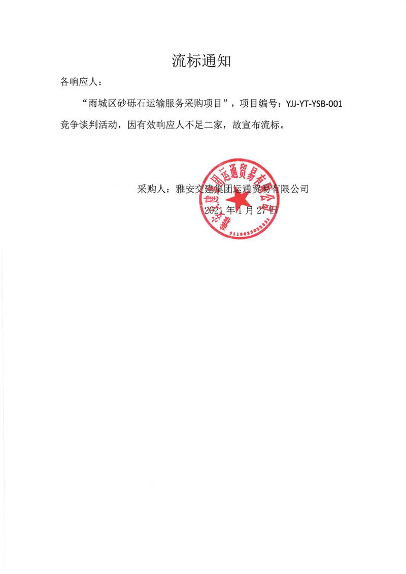 雅安交建集團(tuán)運(yùn)通貿(mào)易有限公司雨城區(qū)砂礫石運(yùn)輸服務(wù)采購(gòu)項(xiàng)目流標(biāo)通知