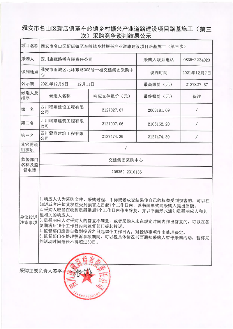 四川康藏路橋有限責(zé)任公司雅安市名山區(qū)新店鎮(zhèn)至車嶺鎮(zhèn)鄉(xiāng)村振興產(chǎn)業(yè)道路建設(shè)項(xiàng)目路面施工(第三次)采購競(jìng)爭(zhēng)談判結(jié)果公示