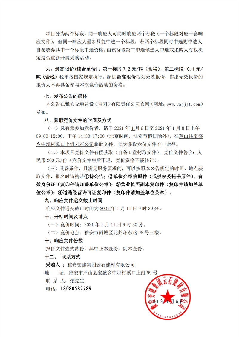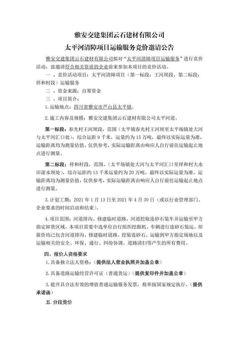 雅安交建集團云石建材有限公司太平河清障項目運輸服務(wù)競價邀請公告