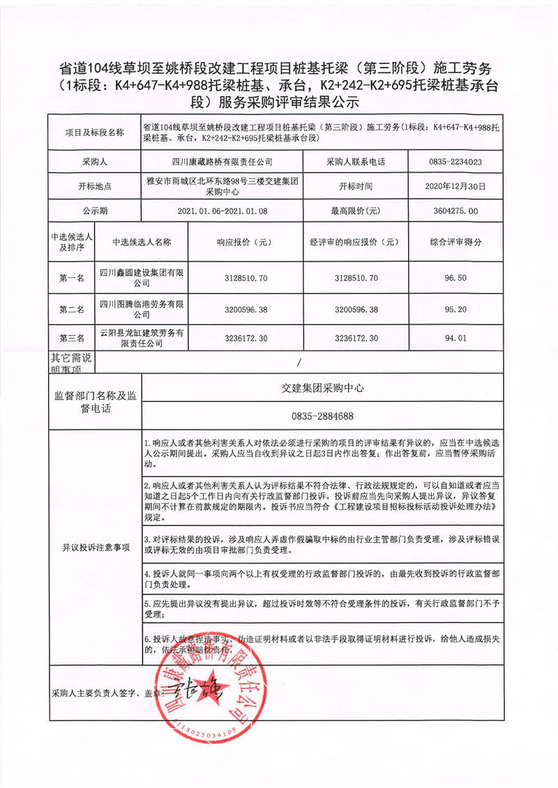 四川康藏路橋有限責(zé)任公司省道104線草壩至姚橋段改建工程項目樁基托梁(第三階段)施工勞務(wù)服務(wù)1標(biāo)段采購評審結(jié)果公示