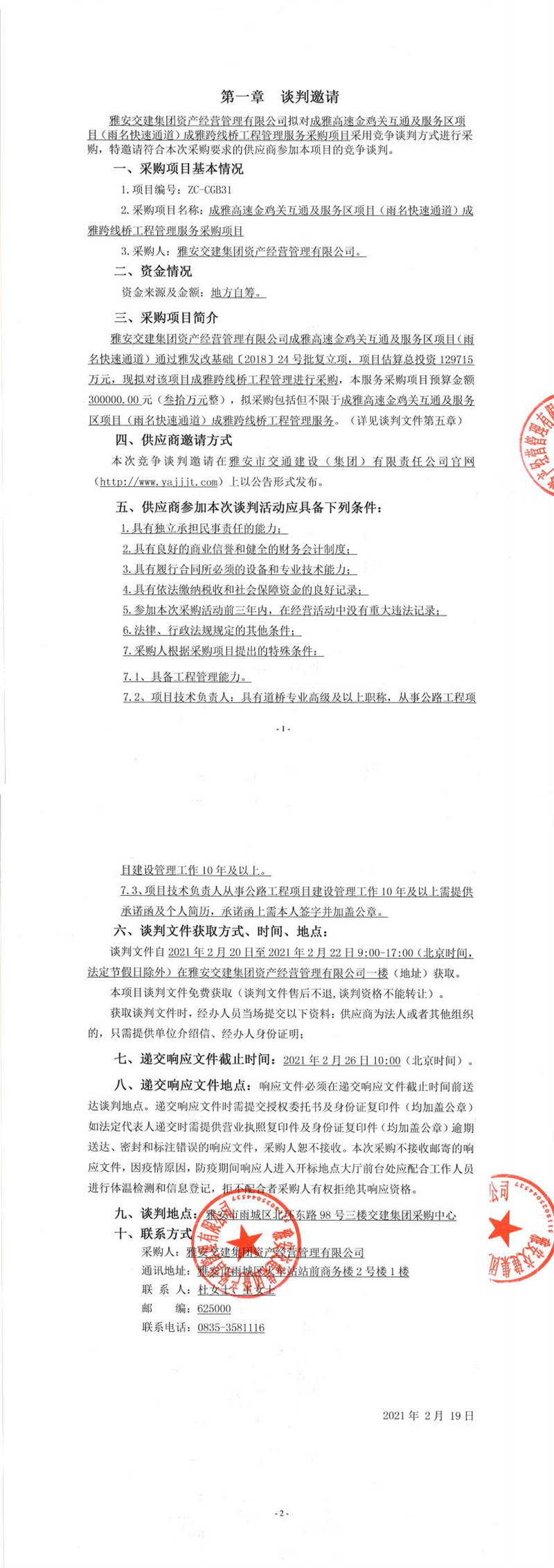 雅安交建集團(tuán)資產(chǎn)經(jīng)營(yíng)管理有限公司成雅高速金雞關(guān)互通及服務(wù)區(qū)項(xiàng)目(雨名快速通道)成雅跨線橋工程管理服務(wù)采購(gòu)項(xiàng)目競(jìng)爭(zhēng)談判公告