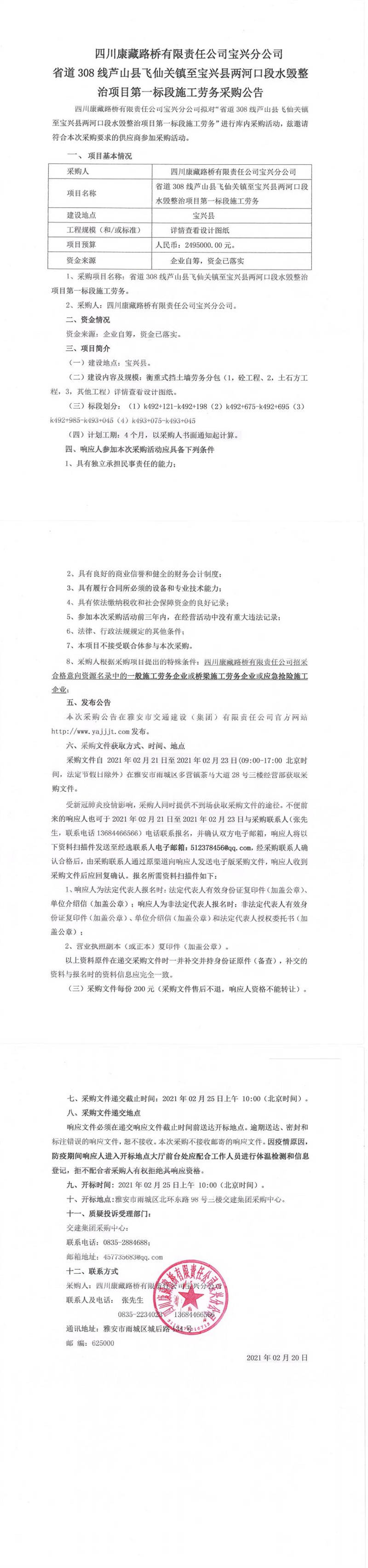 四川康藏路橋有限責(zé)任公司寶興分公司省道308線蘆山縣飛仙關(guān)鎮(zhèn)至寶興縣兩河口段水毀整治項目第一標段施工勞務(wù)采購公告