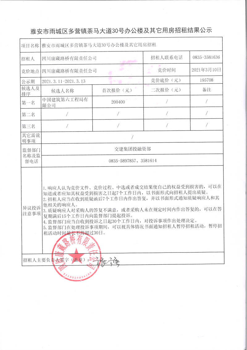 四川康藏路橋有限責(zé)任公司雅安市雨城區(qū)多營(yíng)鎮(zhèn)茶馬大道30號(hào)辦公樓及其它用房招租結(jié)果公示