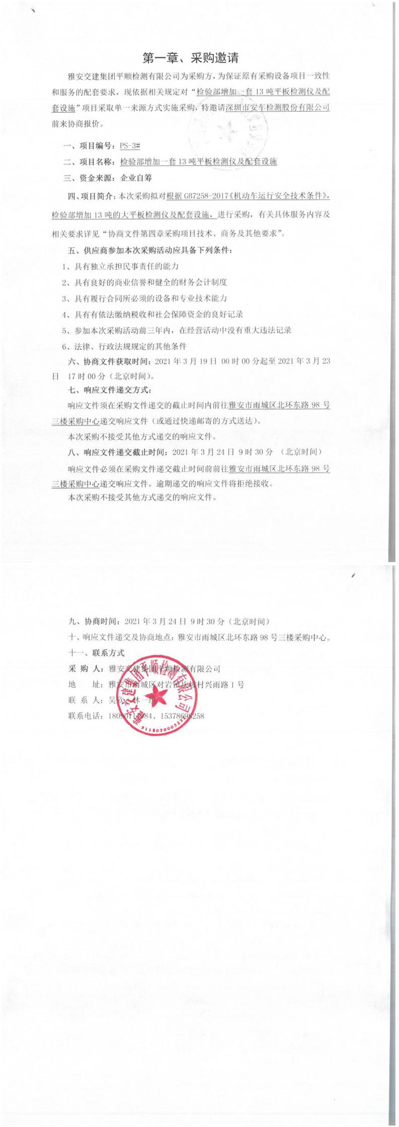 雅安交建集團(tuán)平順檢測有限公司檢驗(yàn)部增加一套13噸平板檢測儀及配套設(shè)施單一來源采購邀請