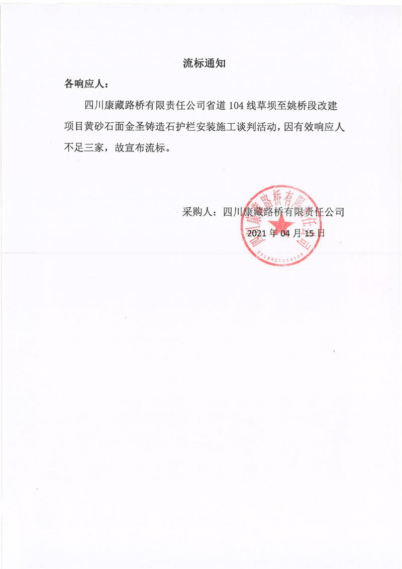四川康藏路橋有限責任公司省道104線草壩至姚橋段改建項目黃砂石面金圣鑄造石護欄安裝施工流標通知