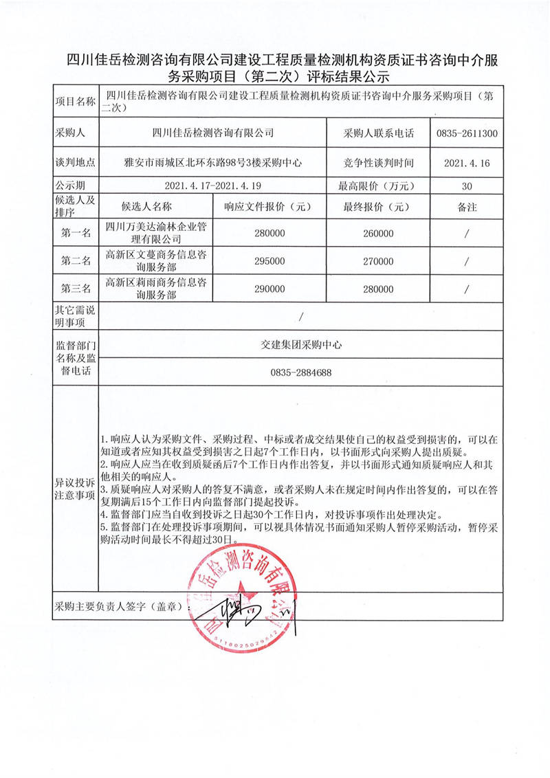 四川佳岳檢測(cè)咨詢有限公司建設(shè)工程質(zhì)量檢測(cè)機(jī)構(gòu)資質(zhì)證書咨詢中介服務(wù)采購(gòu)項(xiàng)目(第二次)評(píng)標(biāo)結(jié)果公示
