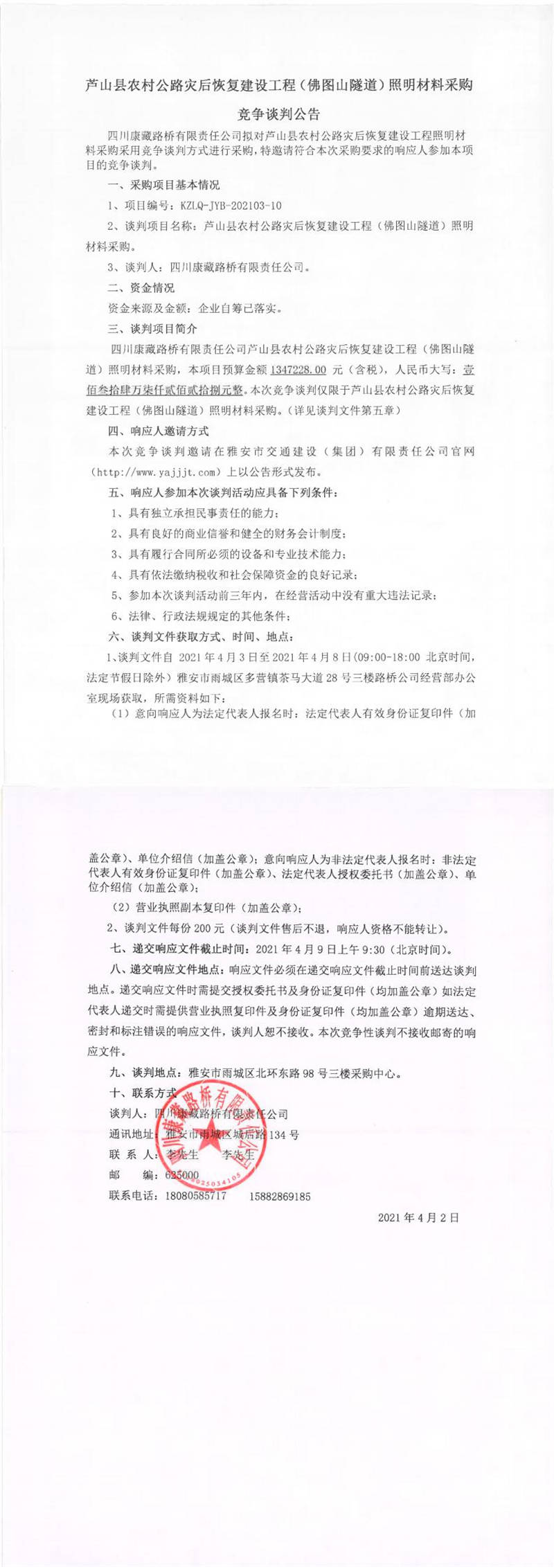 四川康藏路橋有限責(zé)任公司蘆山縣農(nóng)村公路災(zāi)后恢復(fù)建設(shè)工程(佛圖山隧道)照明材料采購競爭談判公告
