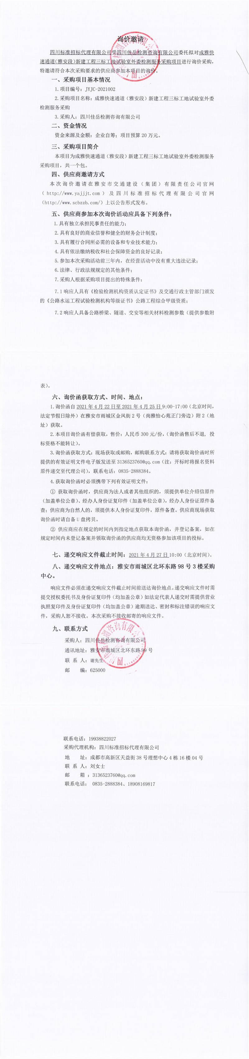 四川佳岳檢測(cè)咨詢(xún)有限公司成雅快速通道(雅安段)新建工程三標(biāo)工地試驗(yàn)室外委檢測(cè)服務(wù)采購(gòu)詢(xún)價(jià)公告