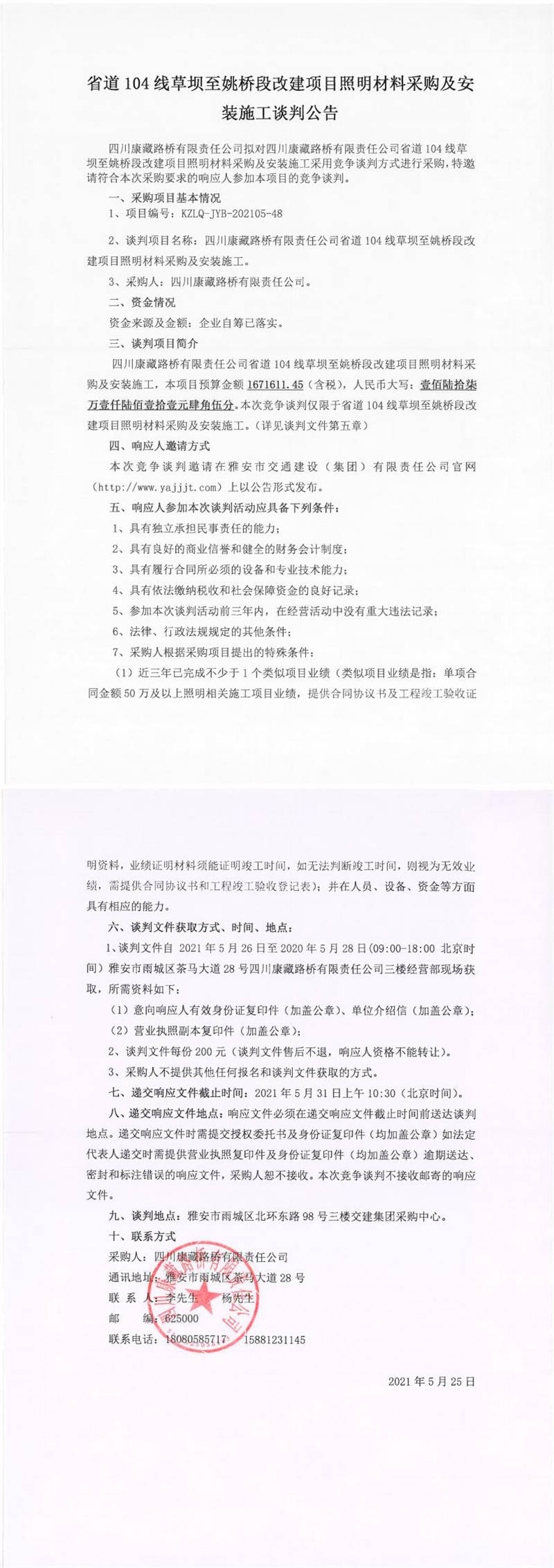 四川康藏路橋有限責(zé)任公司省道104線草壩至姚橋段改建項(xiàng)目照明材料采購(gòu)及安裝施工談判公告