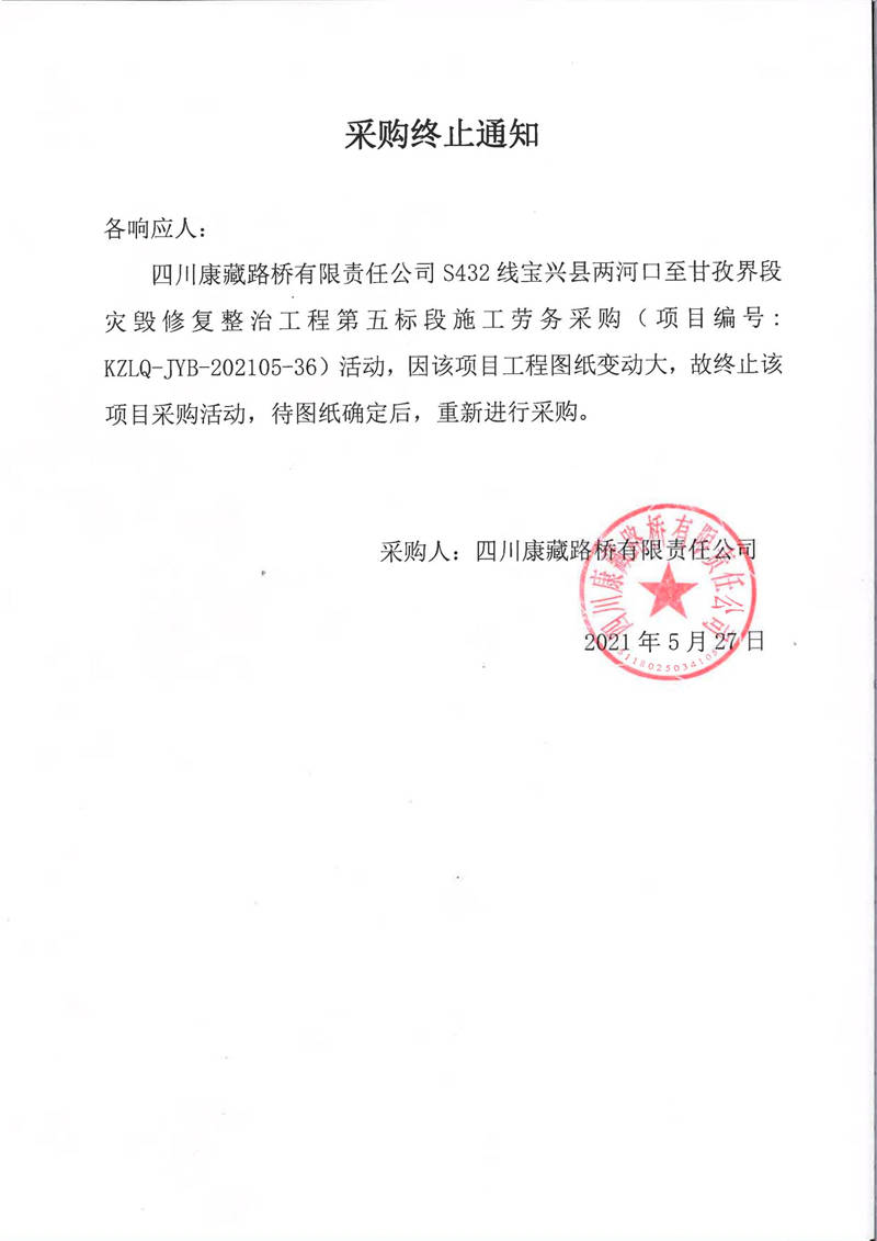 四川康藏路橋有限責(zé)任公司S432線寶興縣兩河口至甘孜界段災(zāi)毀修復(fù)整治工程第五標(biāo)段施工勞務(wù)采購(gòu)終止通知